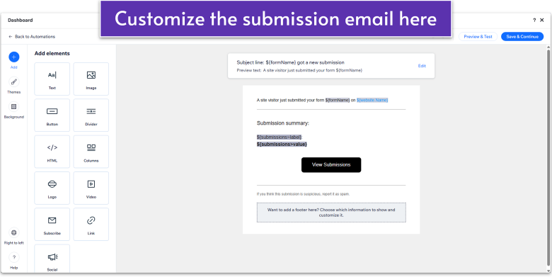 You can edit a series of automations on how your forms behave on submission. Feel free to tinker around here if you want to add more in-depth customization for your forms. At the moment, we’ll just change the basic behavior of the form so the information goes to a specified email address.