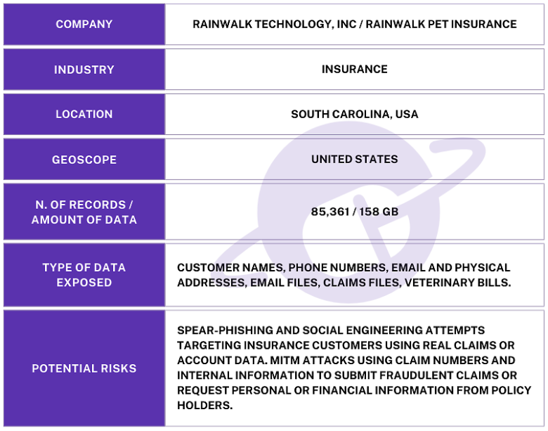 The name of the database along with information from its internal files suggests the records belong to South Carolina-based Rainwalk Technology, which provides pet insurance. I immediately sent a responsible disclosure notice to Rainwalk, and the database remained open for nearly a month before it was restricted from public access and no longer accessible.